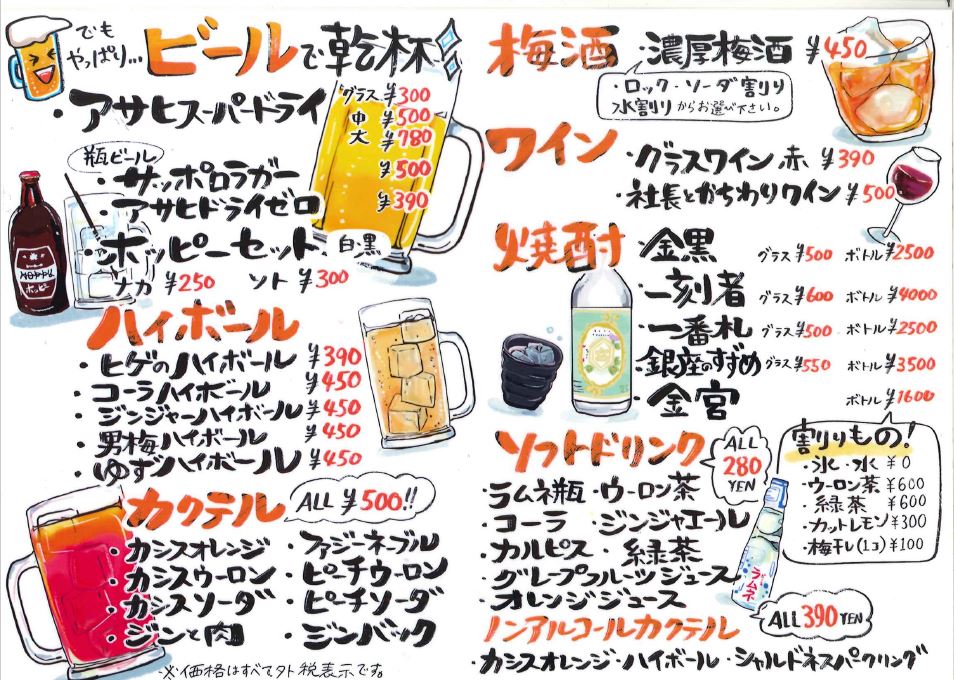 こんな感じじゃないでしょうか?大体6~7商品ほど料理が出て、ドリンク2~3杯頼まれて、一人3,000~4000円くらい。